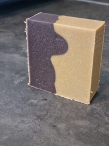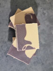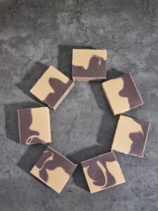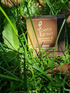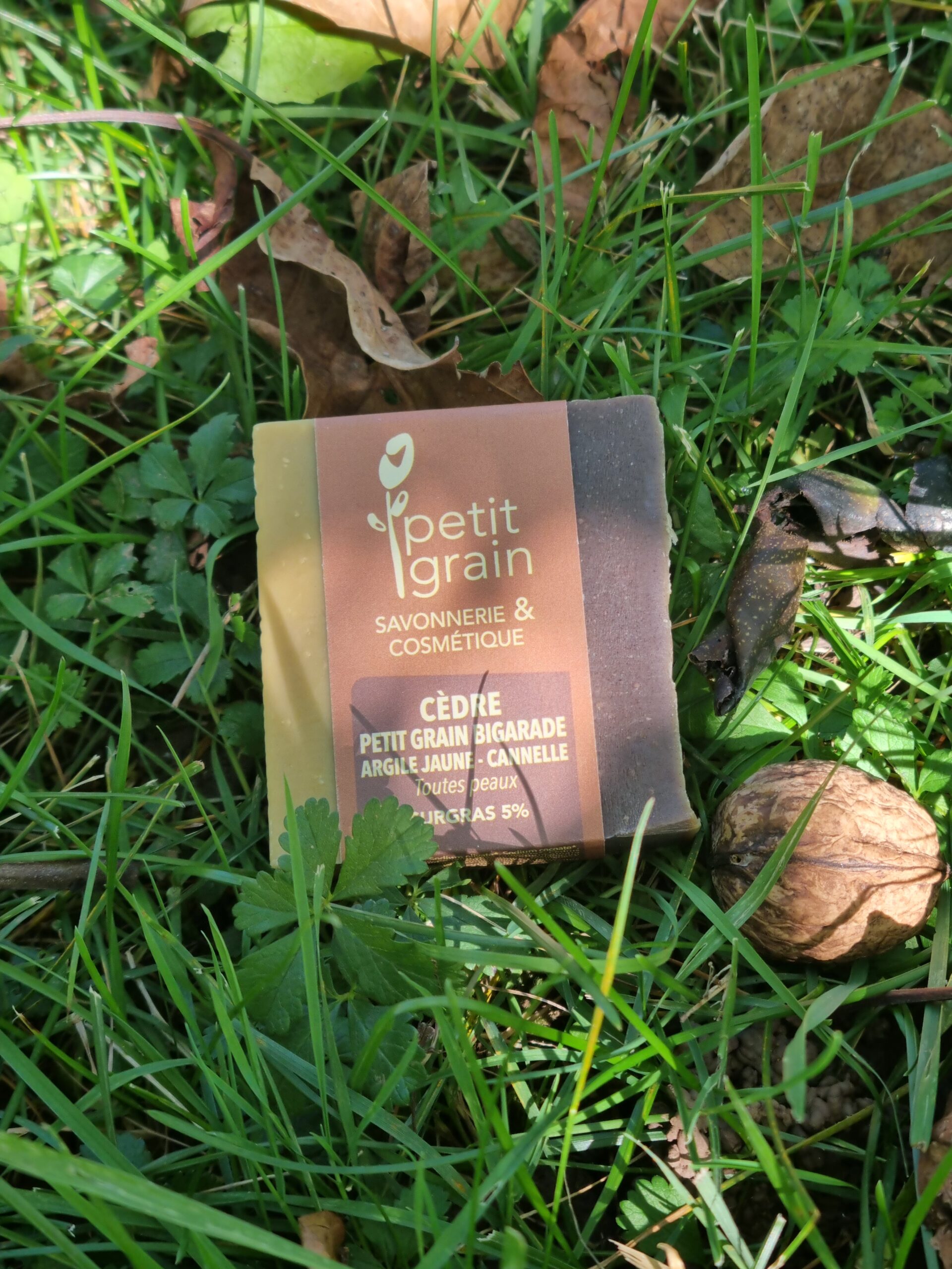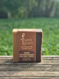 A l’huile essentielle de Cèdre de l’Atlas et de Petit Grain Bigarade, coloré avec de l’argile jaune et de la cannelle en poudre.